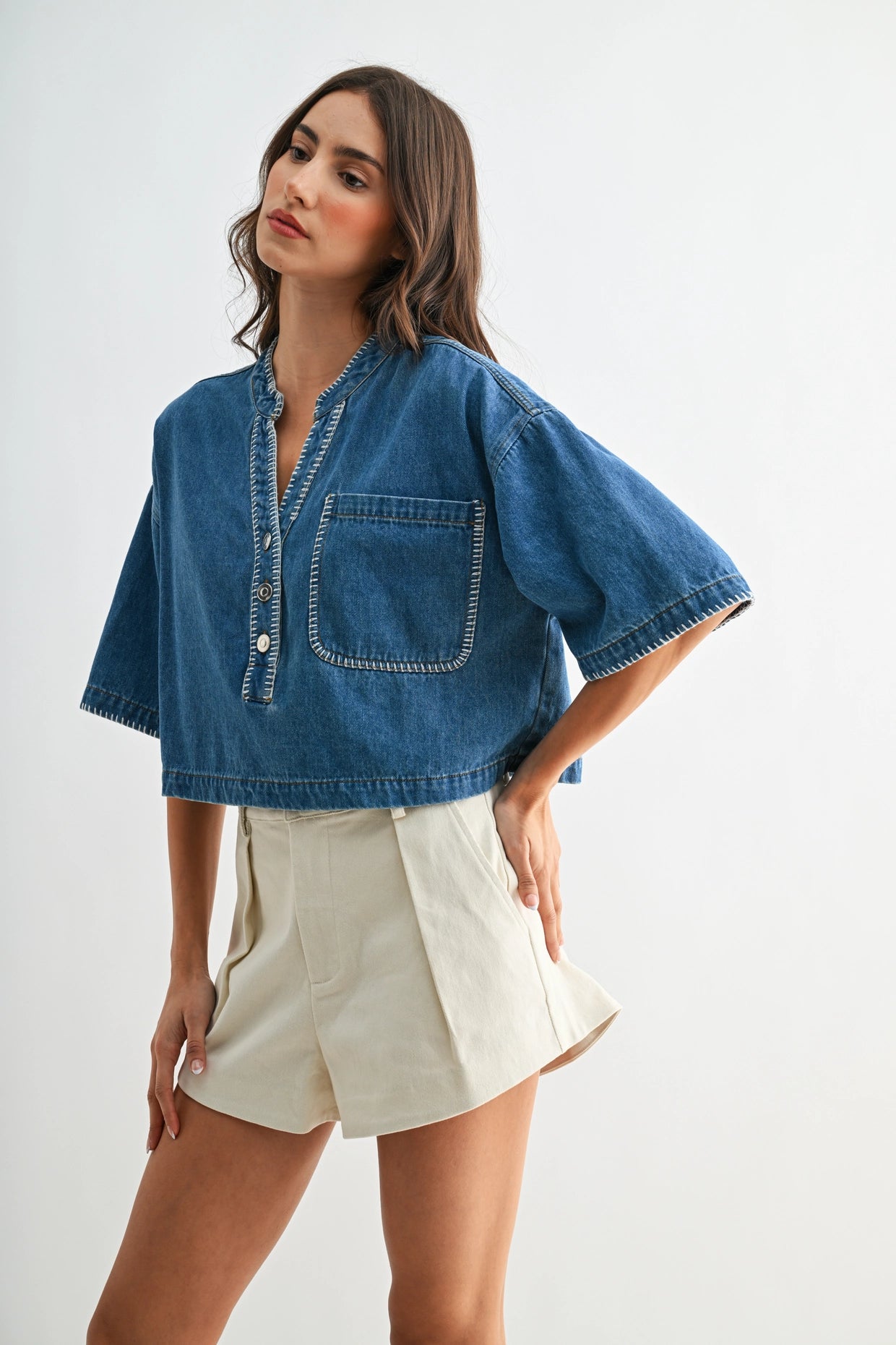 - This cropped denim shirt features a boxy silhouette and a classic medium blue wash. Its front is detailed with a partial button placket, white contrast stitching, and a single chest patch pocket. The design includes wide, dropped sleeves and a defined, straight hem.