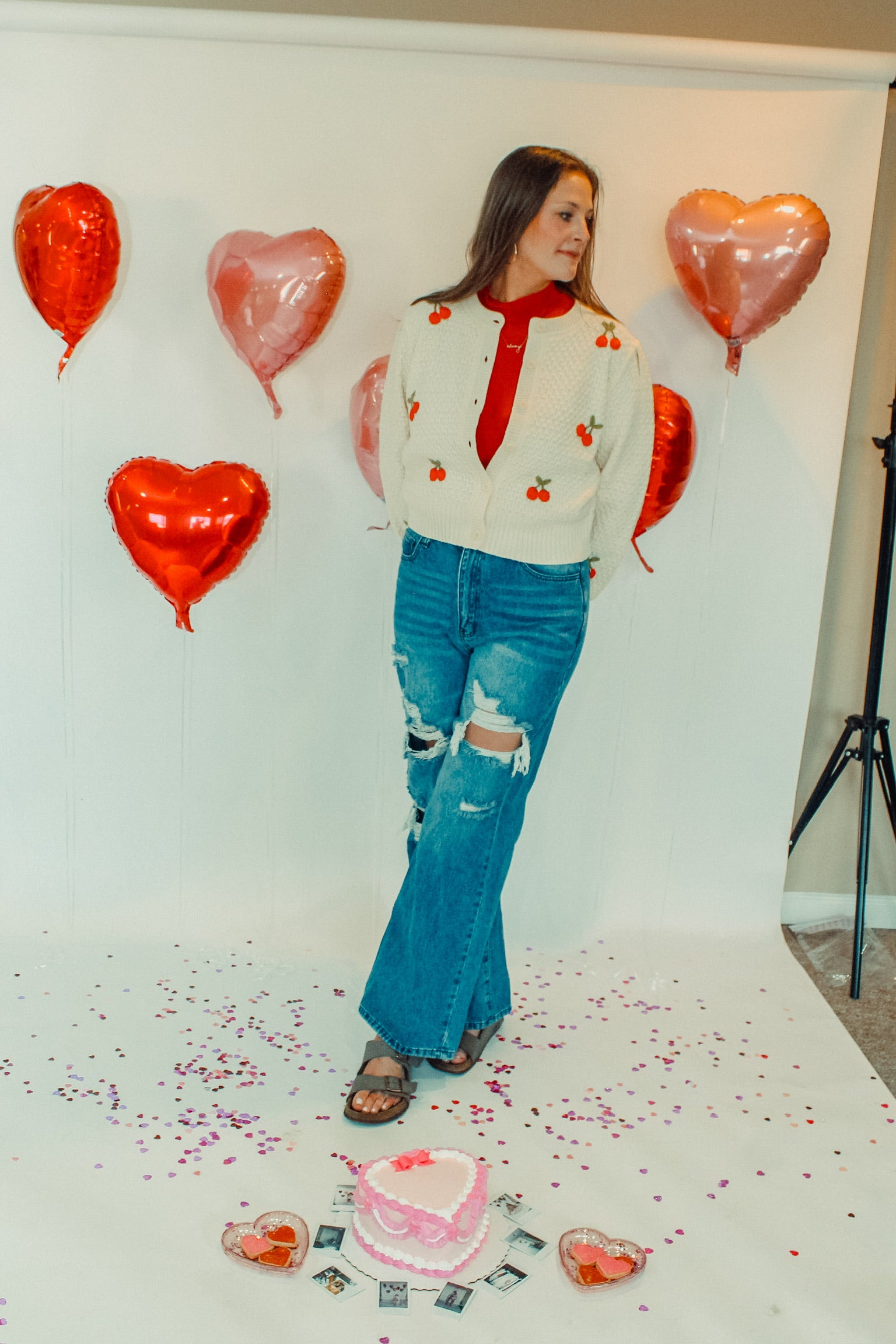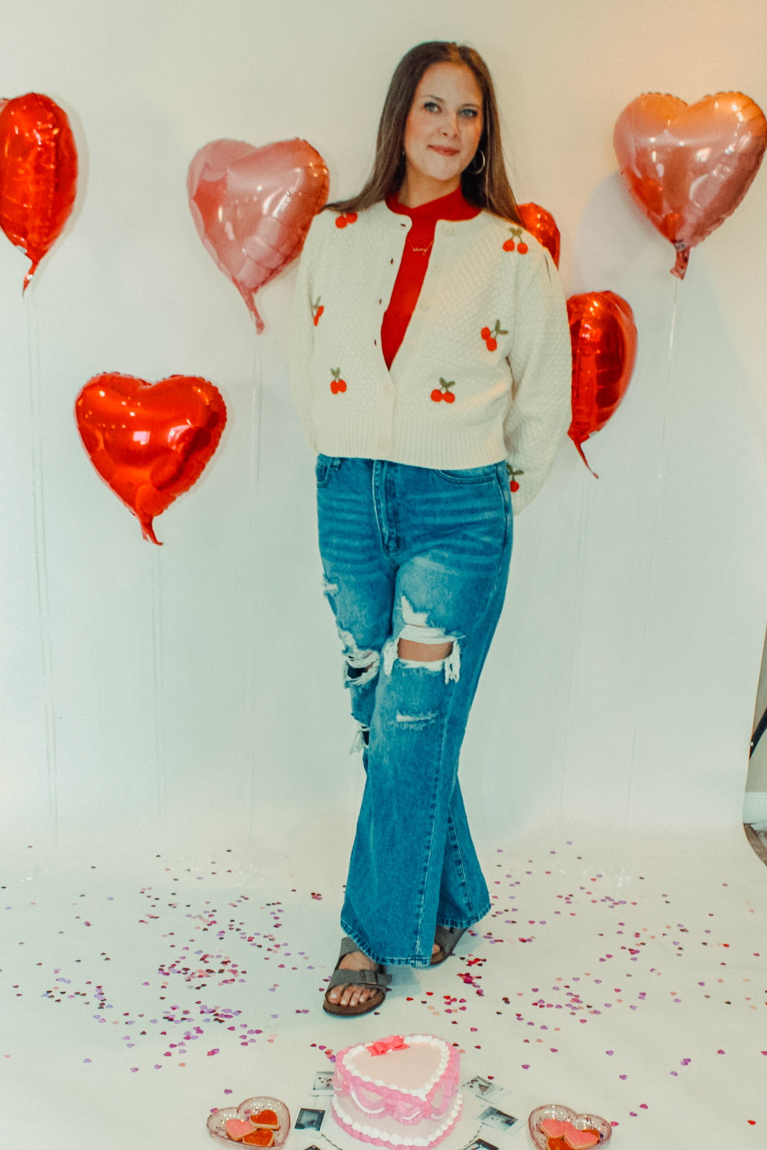 Catch us in this all spring cherry cardigan all spring! It is chunky, warm, perfect for layering, and we love it for a Valentine's look layered with our red, sheer turtleneck.