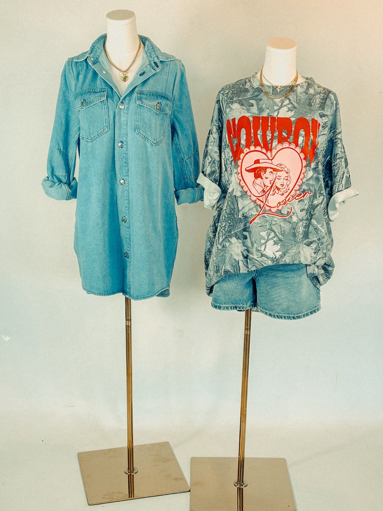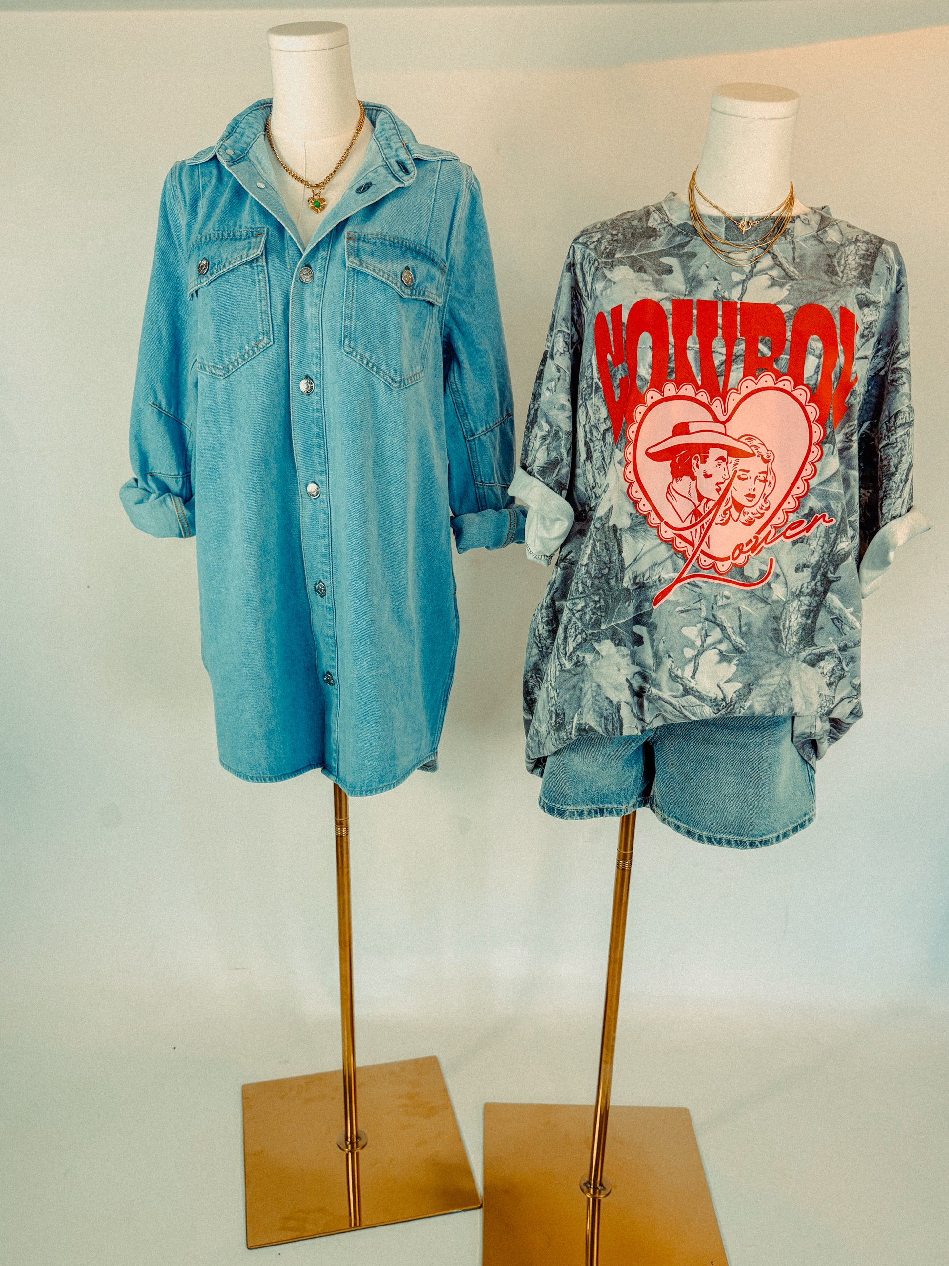 This oversized denim shirt-dress features a relaxed, longline silhouette that hits at a mini length, making it versatile enough to be worn fully buttoned as a dress or open as a lightweight shacket.
