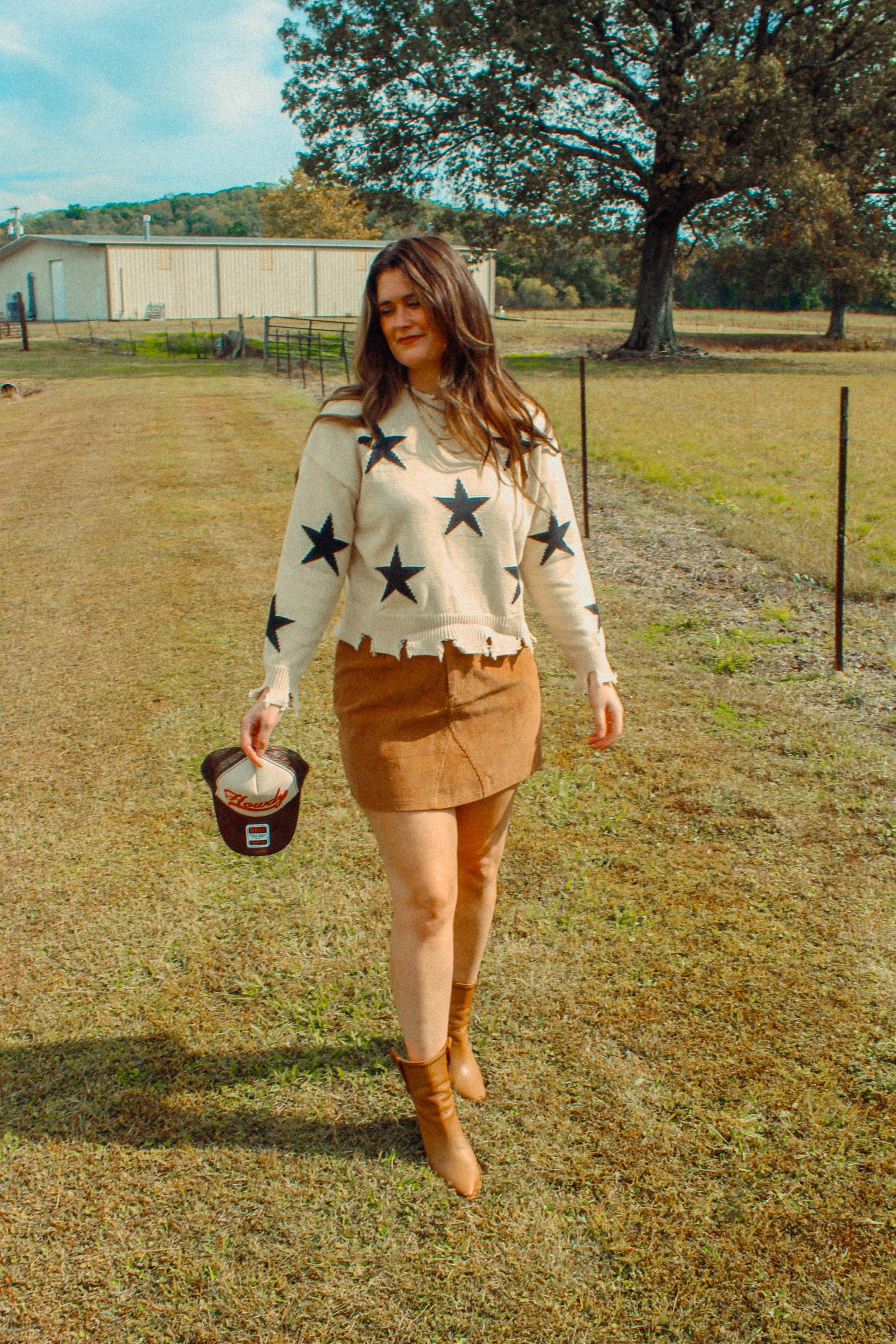 Get all of the starry night vibes in our Distressed Star Print sweater.