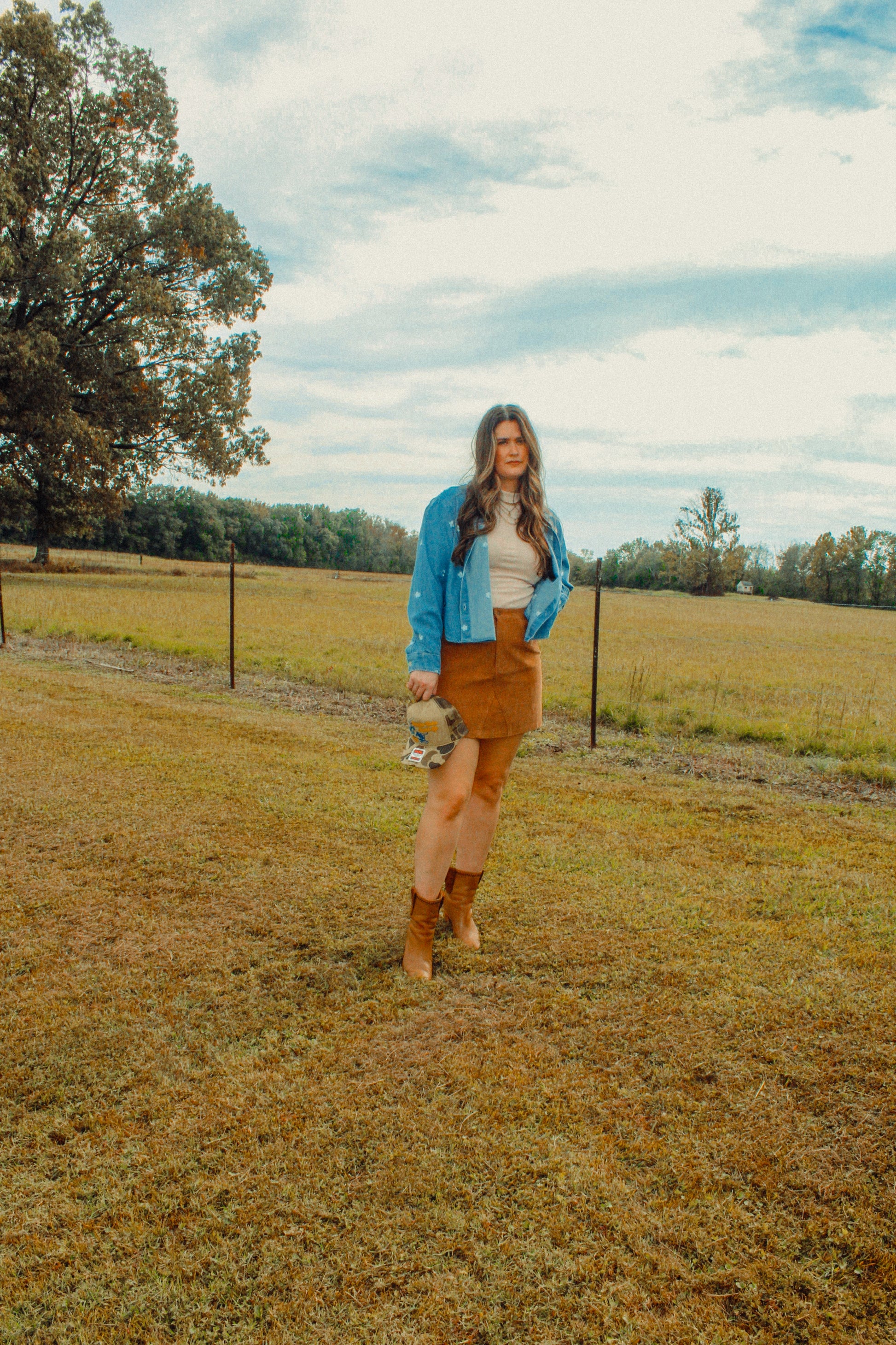 - Features floral embroidery with a button down front and front pocket all in a denim fabric.