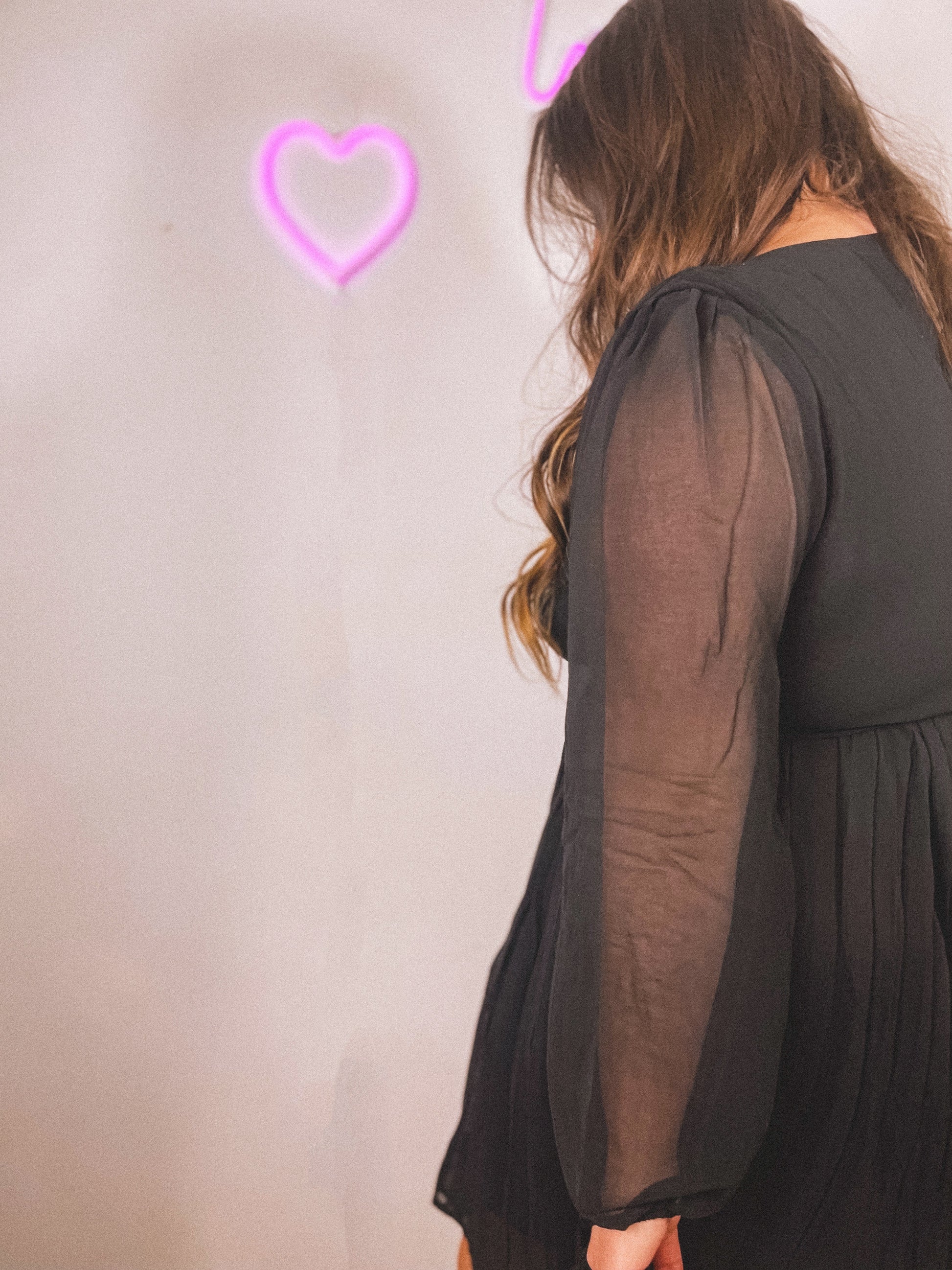 This Black Wrap Dress features see-through sleeves, a wrap waist with ties & a pleated skirt.