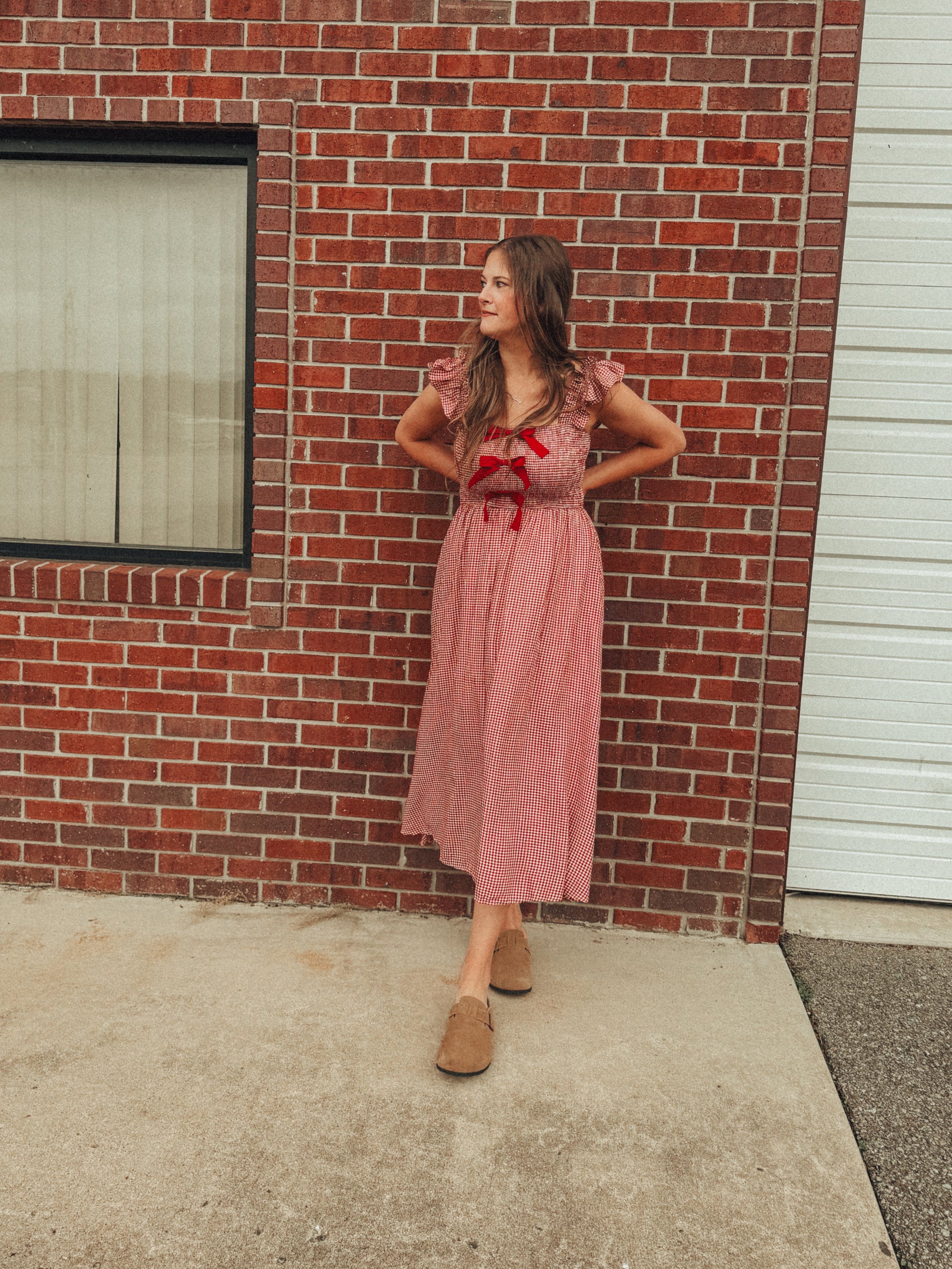 - Features a gingham pattern in red / white with smocking across the top and bow details down the front with ruffle shoulders