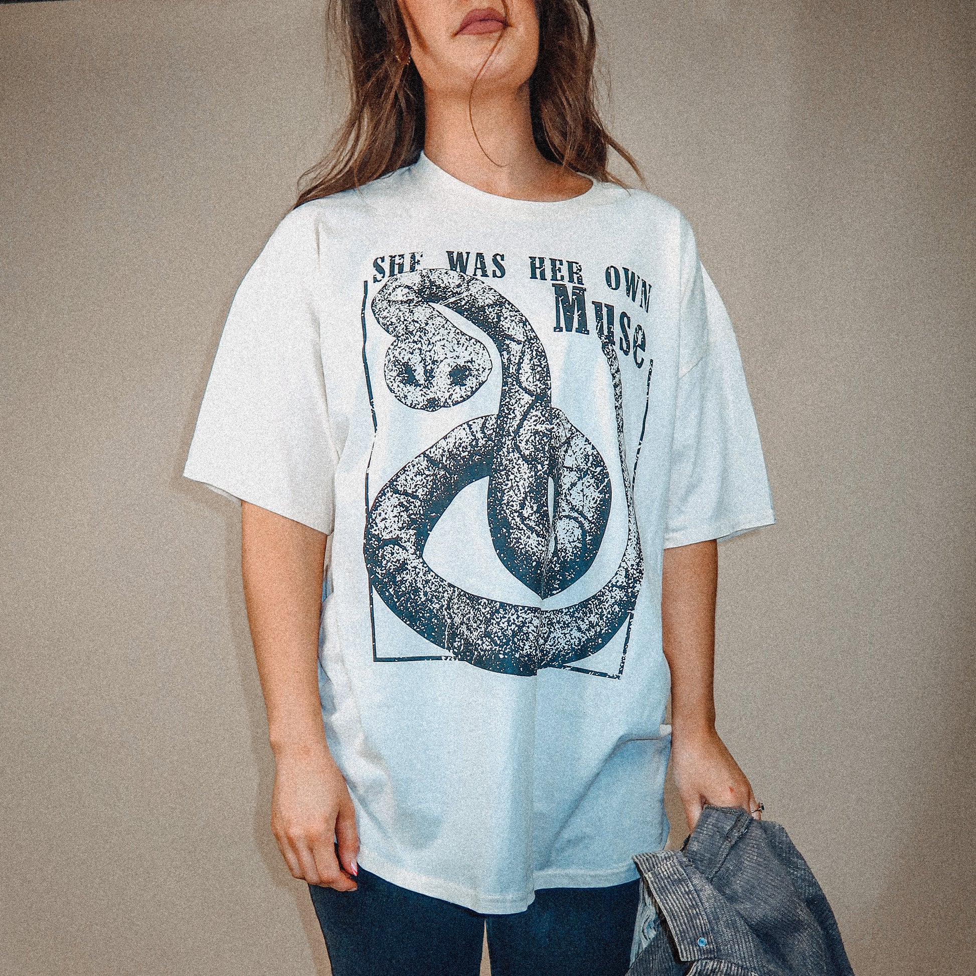 - Features an oversized ornate snake design with "she was her own muse" across the top