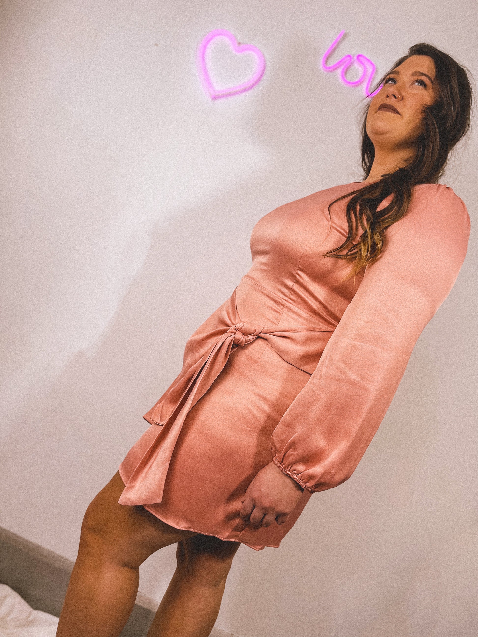 This salmon Satin Dress features a tie waist detail across the waist, long sleeves & a zipper down the back.