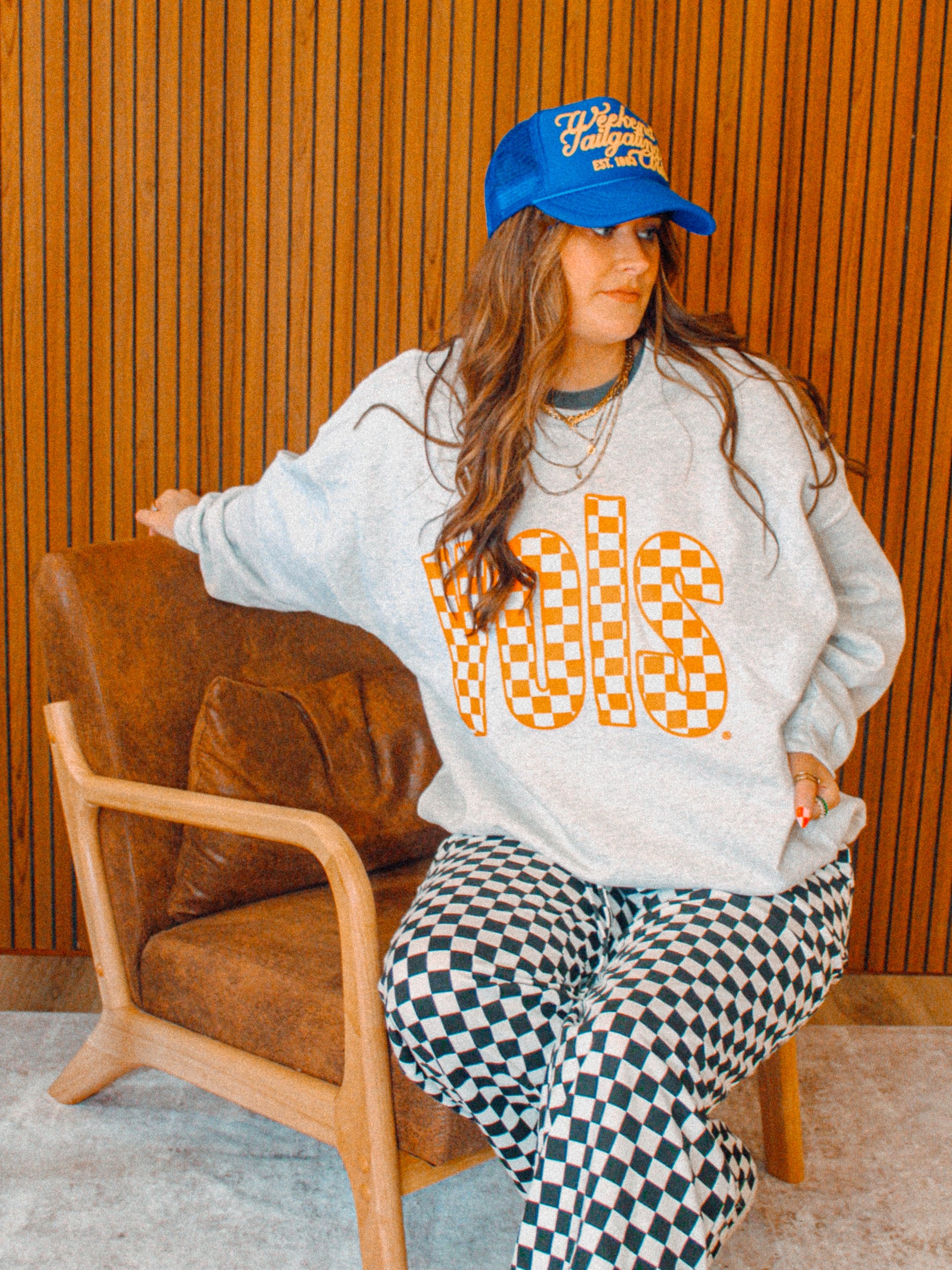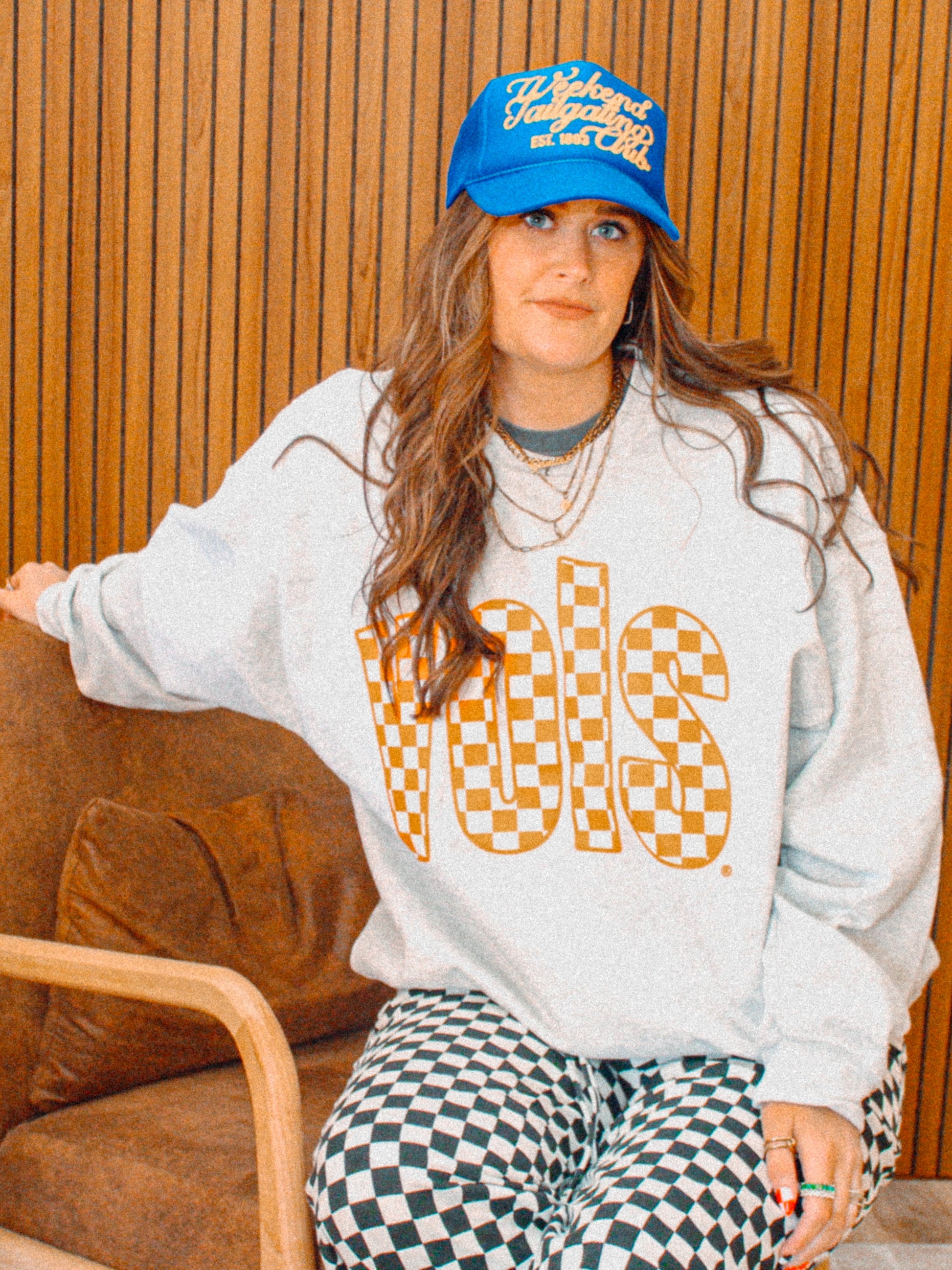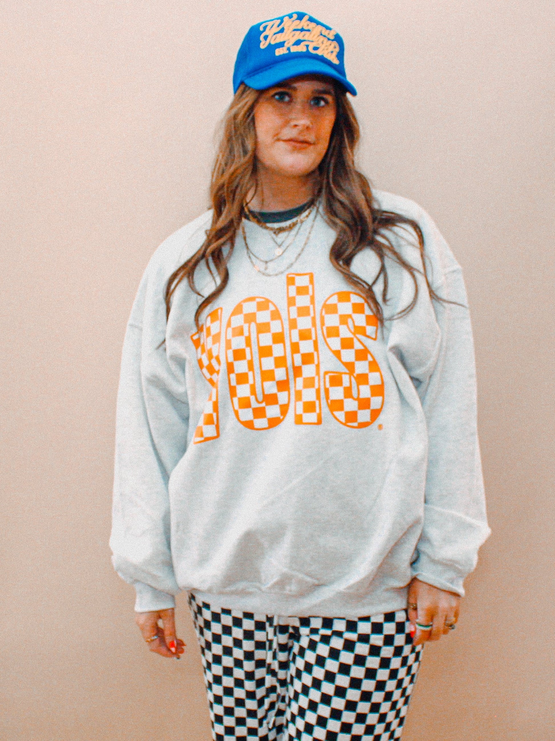 Show the love for your favorite team in this Tennessee VOLS checkerboard oversized sweatshirt that is inspired by vintage 90s college sports sweatshirt, perfect for Game Days!