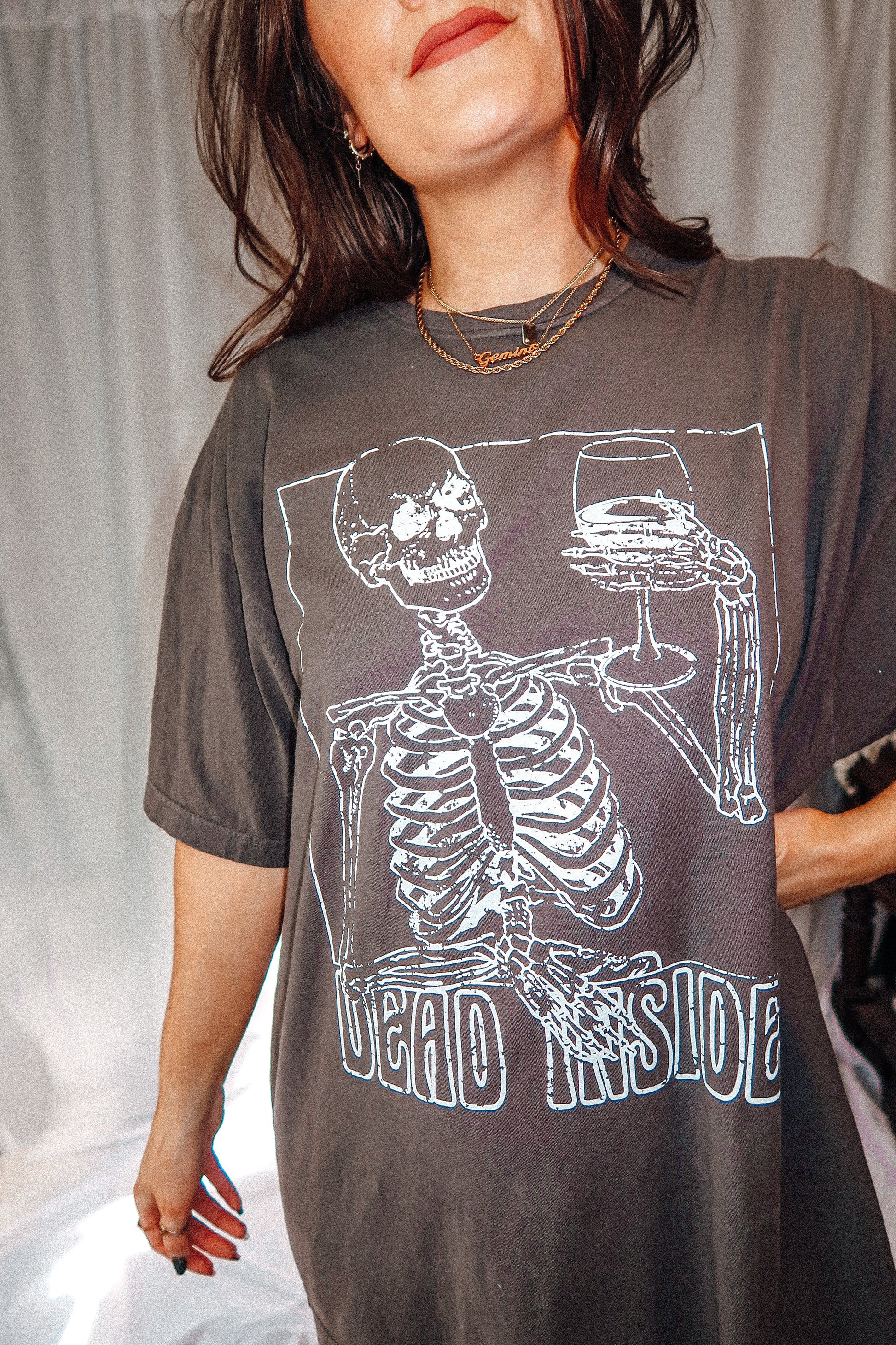 - Features a skeleton holding a glass of wine and the phrase “dead inside” underneath in a white ink with a distressed look