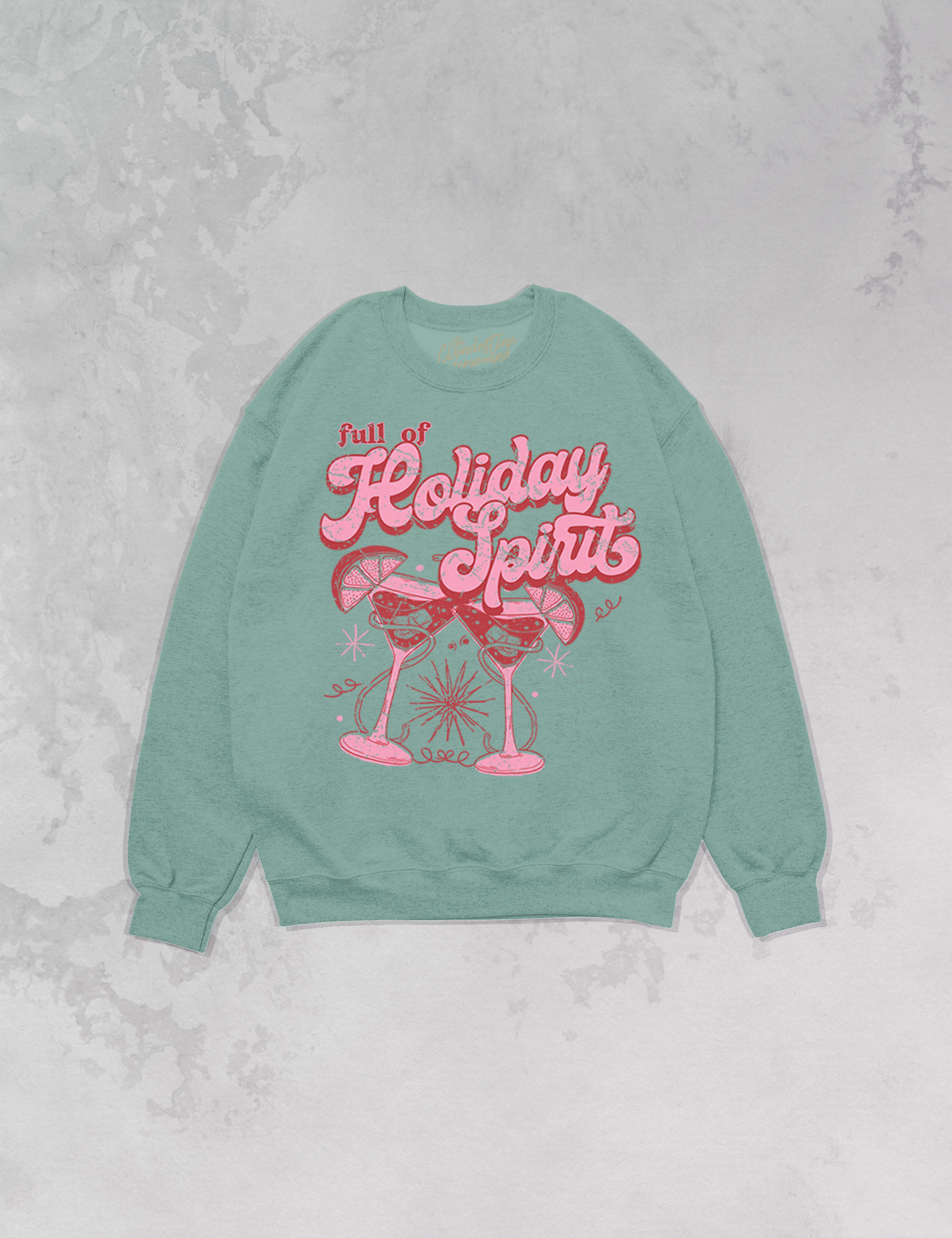 - Features two cocktails with the phrase "full of Holiday Spirit" above it all in a pink and red ink