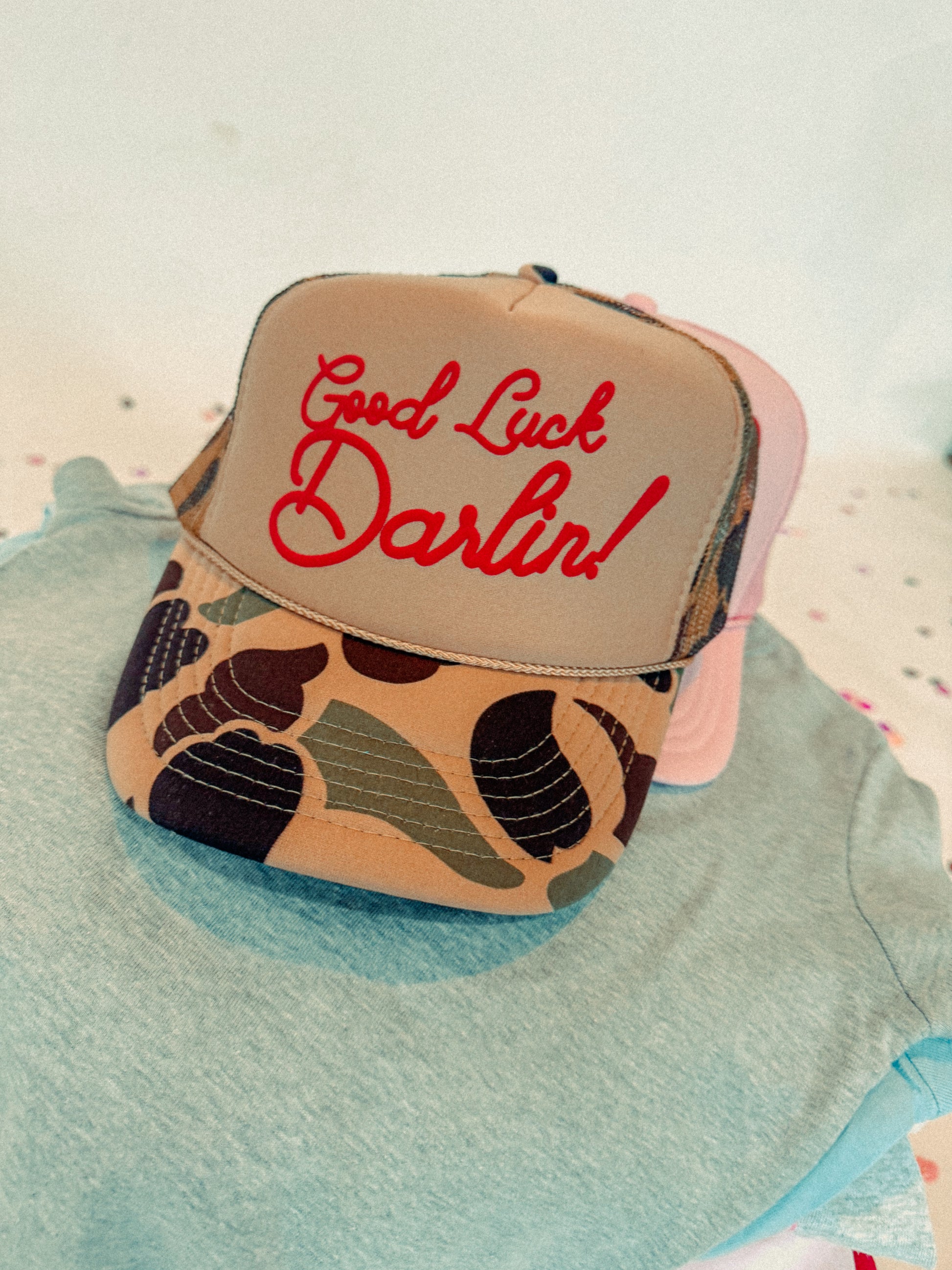 - Features the phrase "Good Luck Darlin!" across the front in a red puff ink