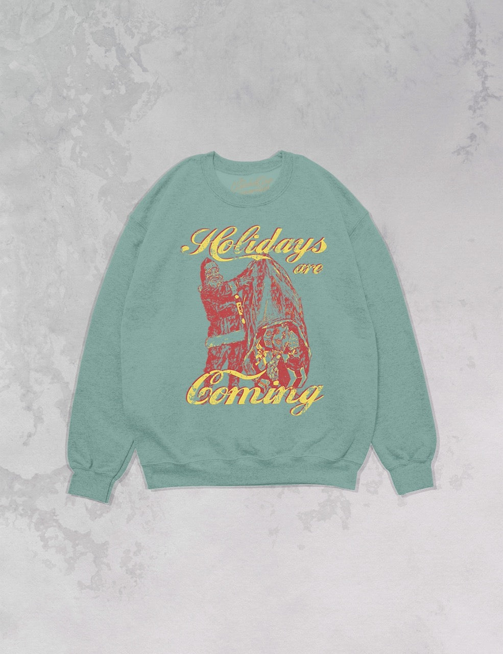 - Features Santa holding a bag of presents and the phrase "Holidays are Coming" in a yellow and red ink, all with a distressed / vintage look, in a red and yellow ink