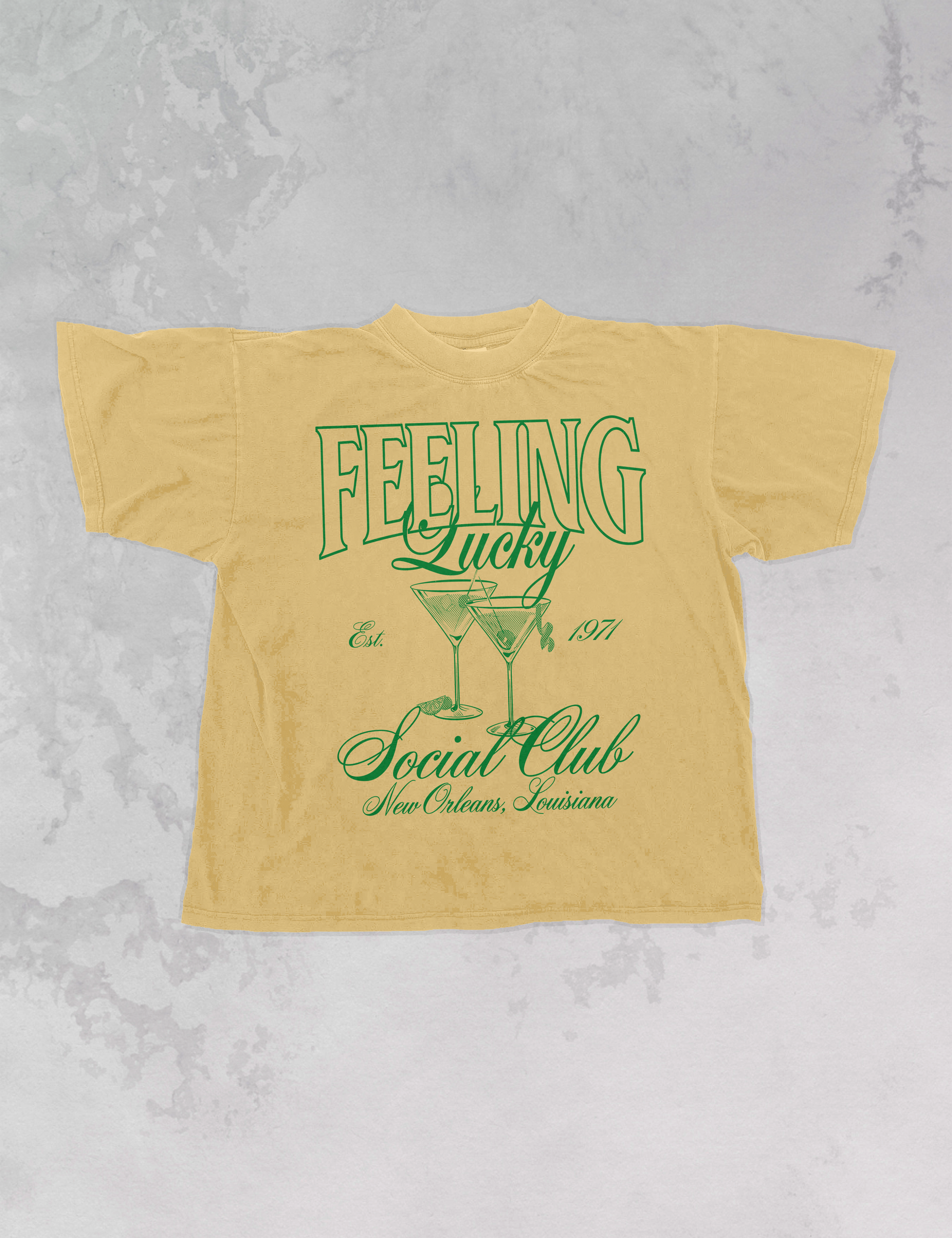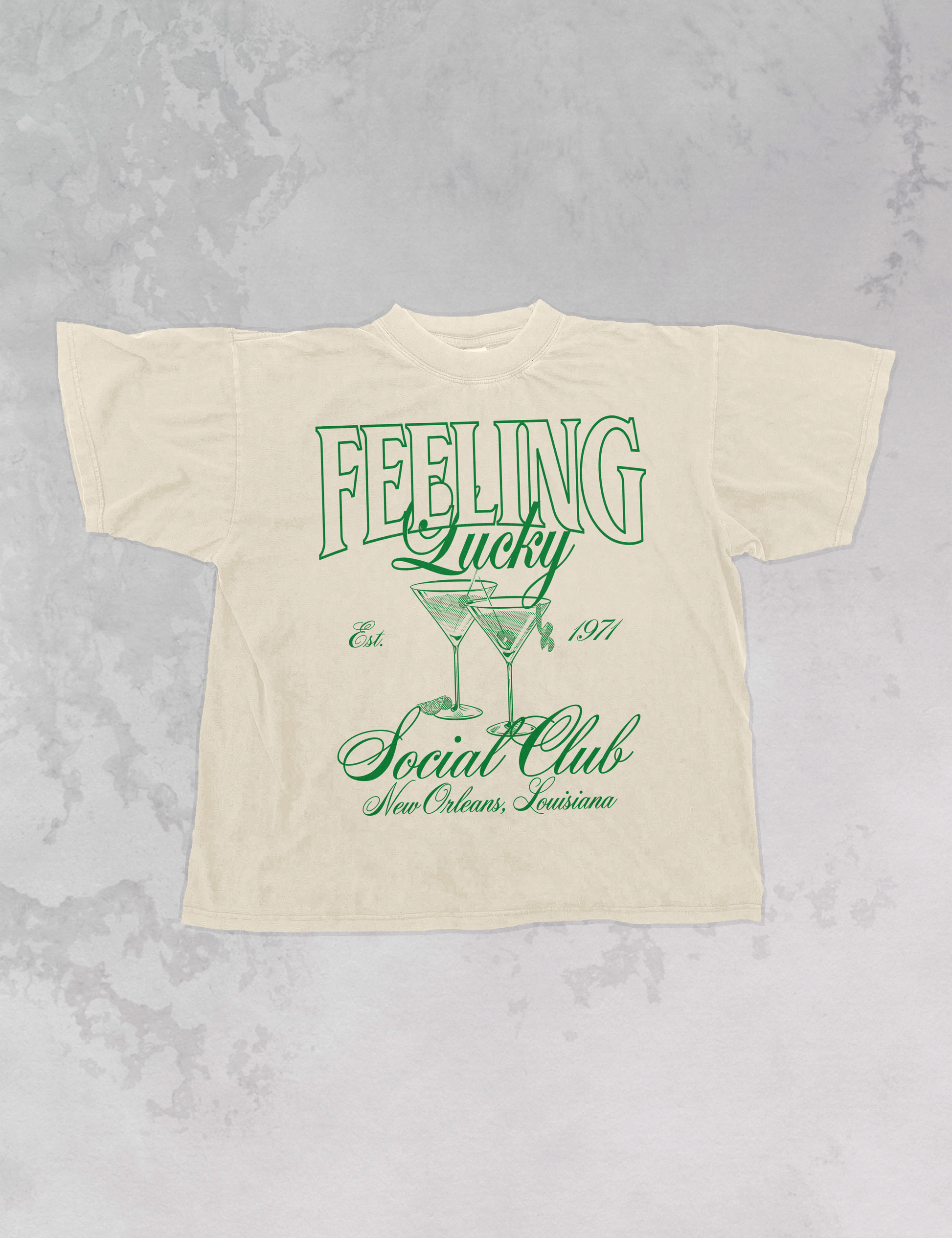 - Features the phrase "Feeling Lucky Social Club" with Martini Glasses and " New Orleans, Louisiana" underneath in a green ink