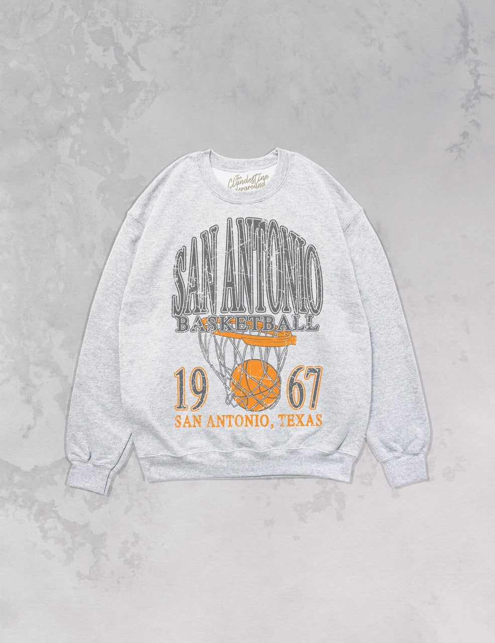 - Features San Antonio Basketball across the top with a basketball hoop and 1967 with San Antonio, Texas underneath all in a charcoal and orange ink