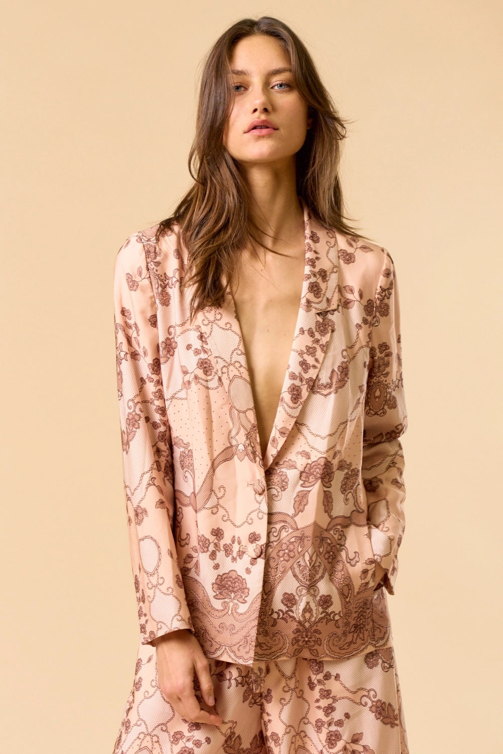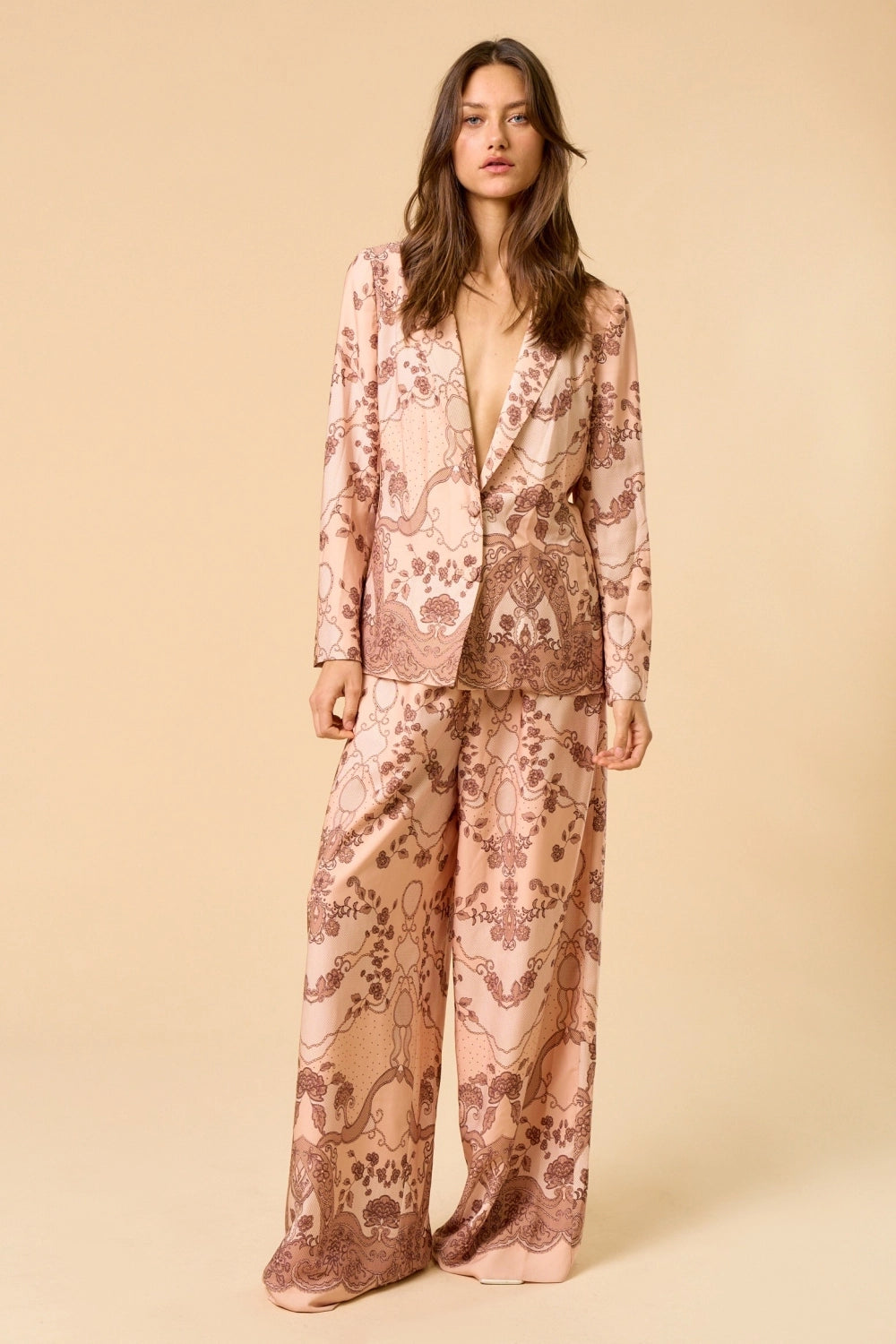 - Vintage lace print in a soft pink color and smooth satin like fabric with elastic waist